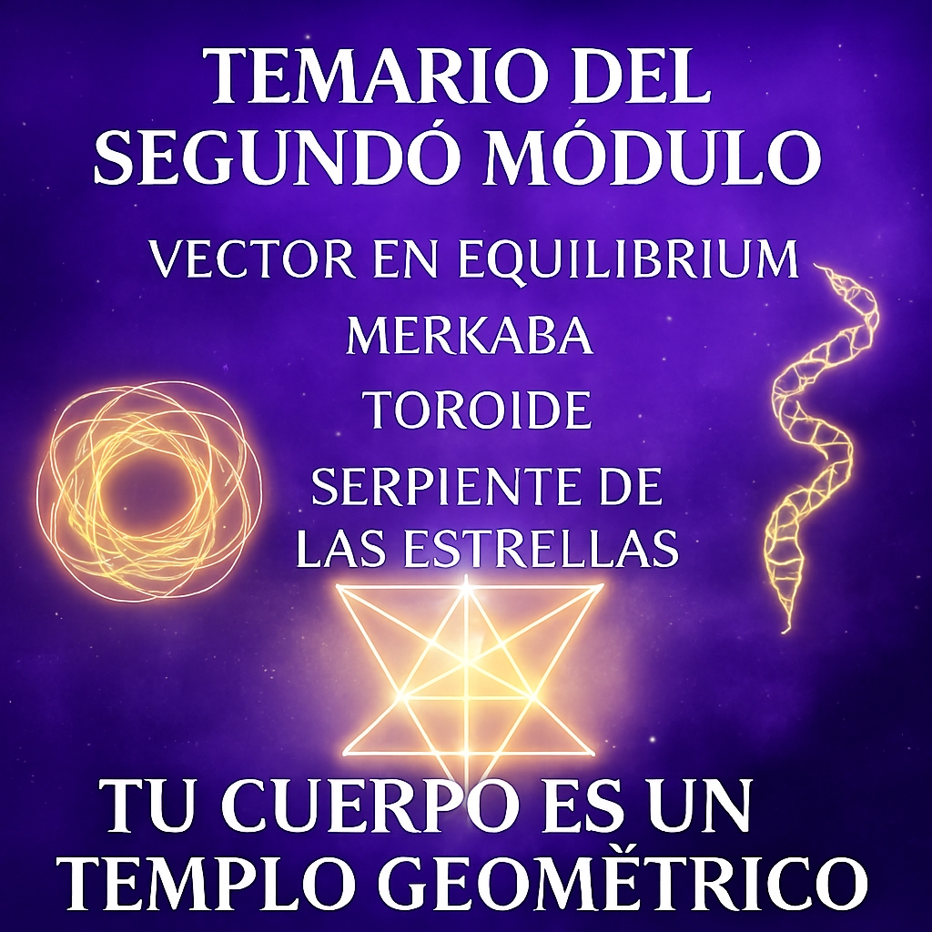 En el SEGUNDO MÓDULO nos vamos a encontrar Lugares sagrados y mágicos. Descifrando el Vector. Símbolo descifrado en tres dimensiones VECTOR EN EQUILIBRIUM "SISTEMA PERSONALIZADO" Y NECESARIO PARA COMPLETAR EL CUBO DE METATRÓN. Qué significa el Merkaba, activación Iniciática y utilización. Vídeos con la formación del vector en equilibrium y el toroide. Símbolo "Serpiente de las Estrellas", activación de nuestro ADN. Ejercicios de sanación. Geometría sagrada en tu hogar: Purificar espacios y evitar que las energías externas nos afecten. Cierre de portales y sellado.