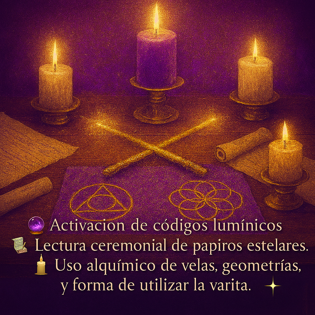 Esta experiencia no es un curso más. Es una activación energética, una ceremonia privada donde las varitas de luz despiertan memorias antiguas, los papiros estelares revelan códigos, y la alquimia se manifiesta en tu presencia.